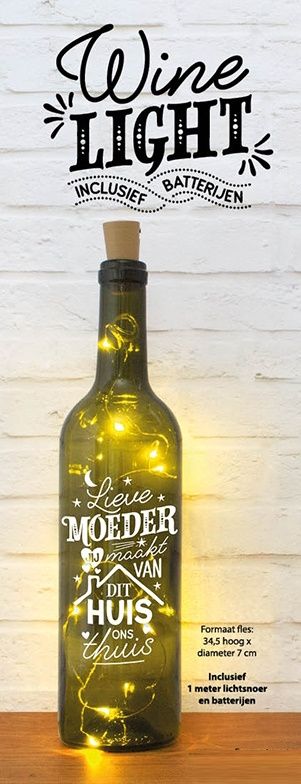 De Wine Light is een decoratieve wijnfles waarin vrolijk twinkelende lichtjes en liefdevolle complimenten centraal staan. De Wine Light is perfect geschikt als decoratie op iedere vensterbank of op iedere salontafel en brengt dus gezelligheid met zich mee voor elk interieur.